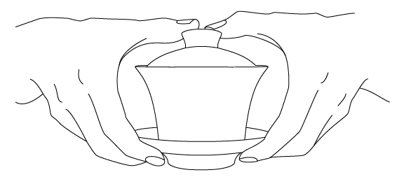 Though not how you'll see it done in China, our favorite and most secure way to hold the gaiwan is by placing two fingers of each hand underneath the plate, and using your thumbs to hold the top of the knob and secure the lid. Rotate your thumbs toward your body, straining the leaves with the lid while decanting the liquid.